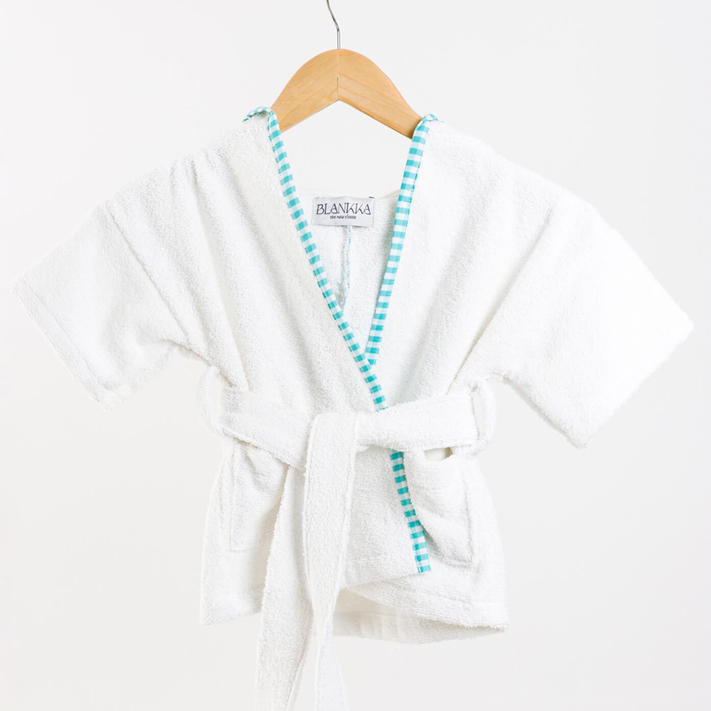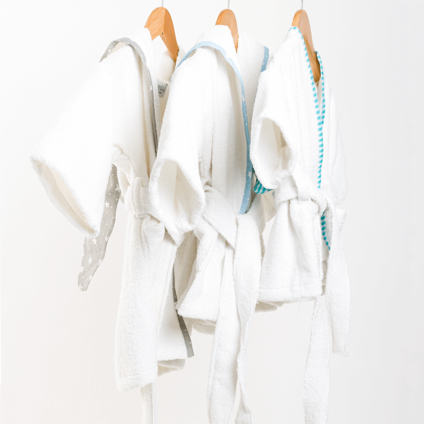La bata es elaborada en toalla blanca. Color de la caracterización y bies: azul, rosa, gris, crudo, arcoíris.